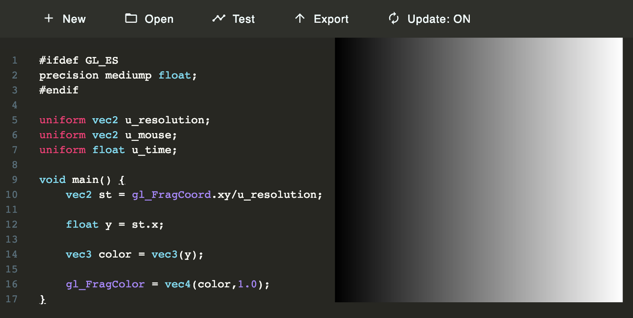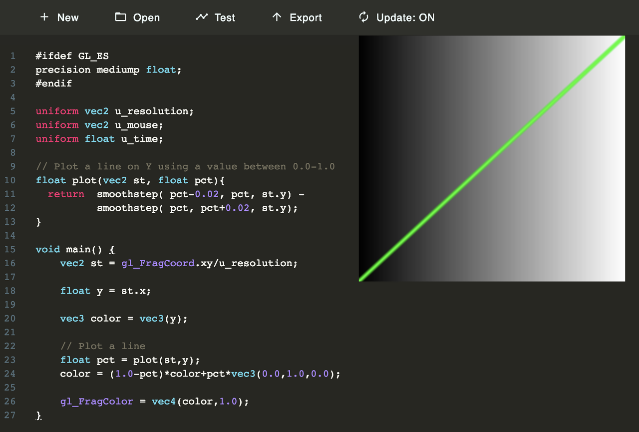 In it, we visualize the normalized value of the x coordinate (st.x) in two ways: one with brightness (observe the nice gradient from black to white) and the other by plotting a green line on top (in that case the x value is assigned directly to y).