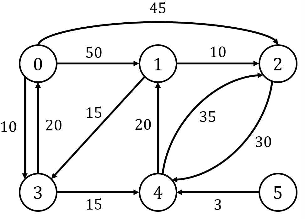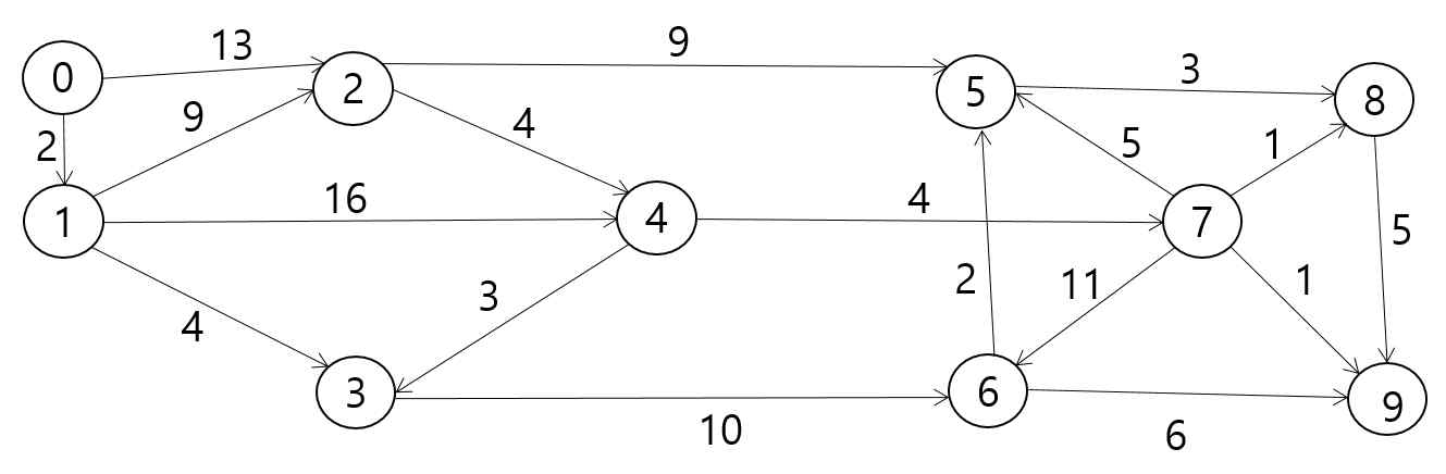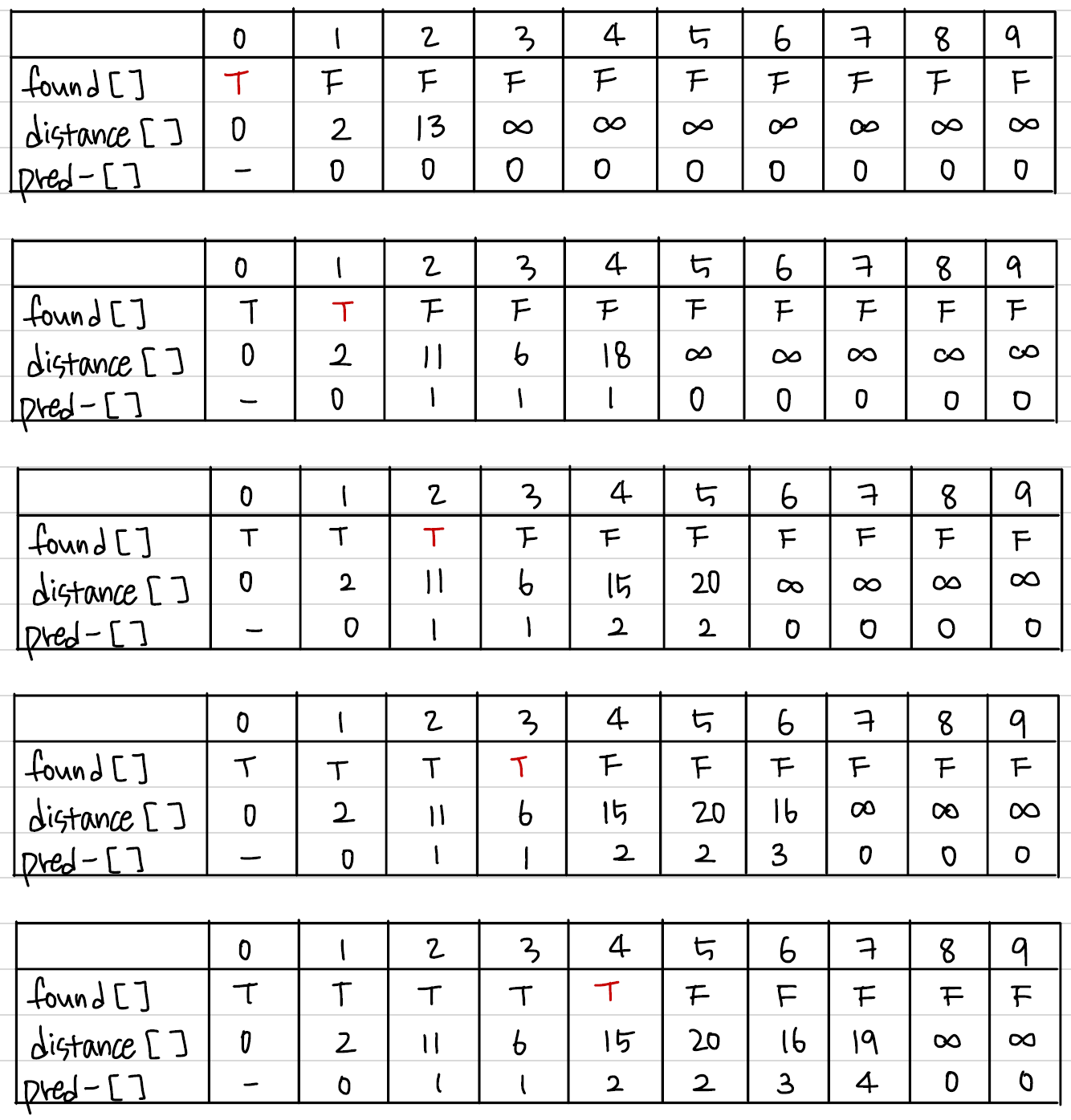 (a) 아래 graph에서 0번 노드에서 모든 노드로의 shortest path를 수업시간에 공부한 교재의 Dijkstra의 알고리즘으로 구할 때 수업시간에 아래 형식의 표로 작성했던 방식대로 found 배열, distance 배열, predecessor 배열의 값이 변경되어 가는 과정을 알고리즘이 종료될 때까지 보이면서 설명하시오.