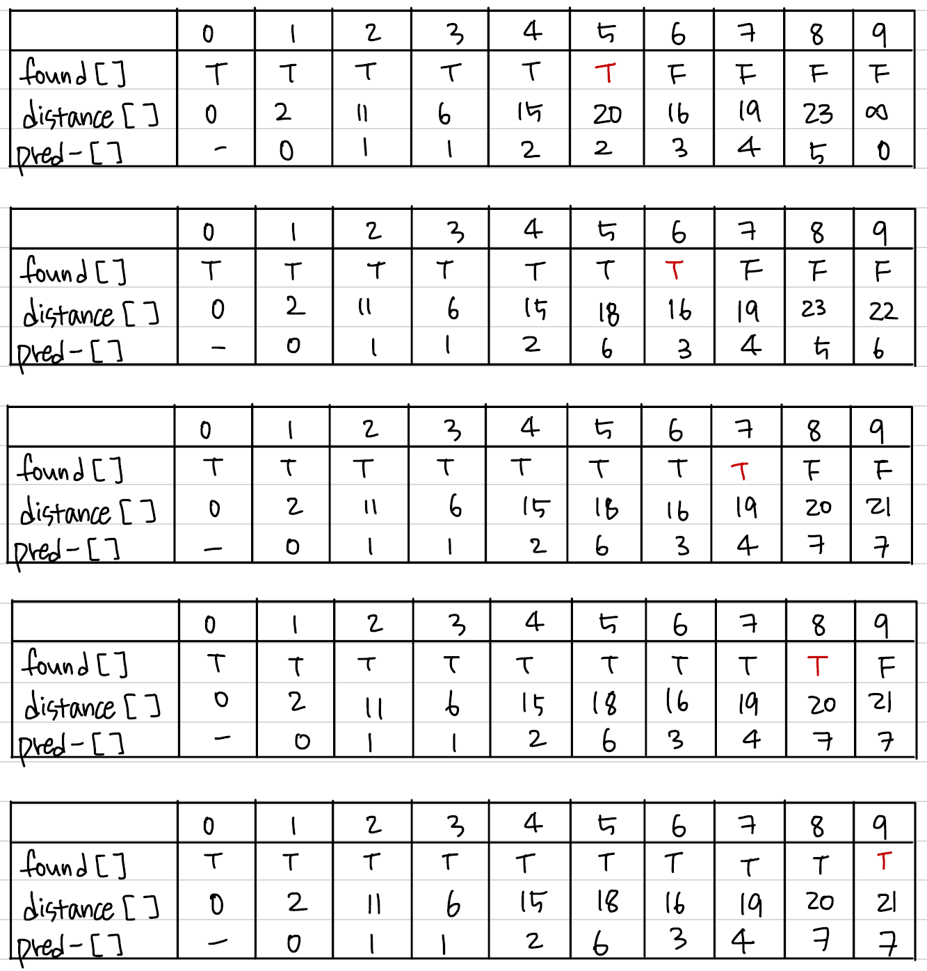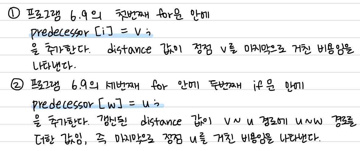 (b) 교재 Program 6.9는 그래프에서 shortest path를 구하는 과정에서 found[] 배열과 distance[] 배열만 사용한다. 이를 predecessor[] 배열도 사용하도록 하려면 프로그램의 어느 부분을 어떻게 수정해야 하는지 설명하시오.