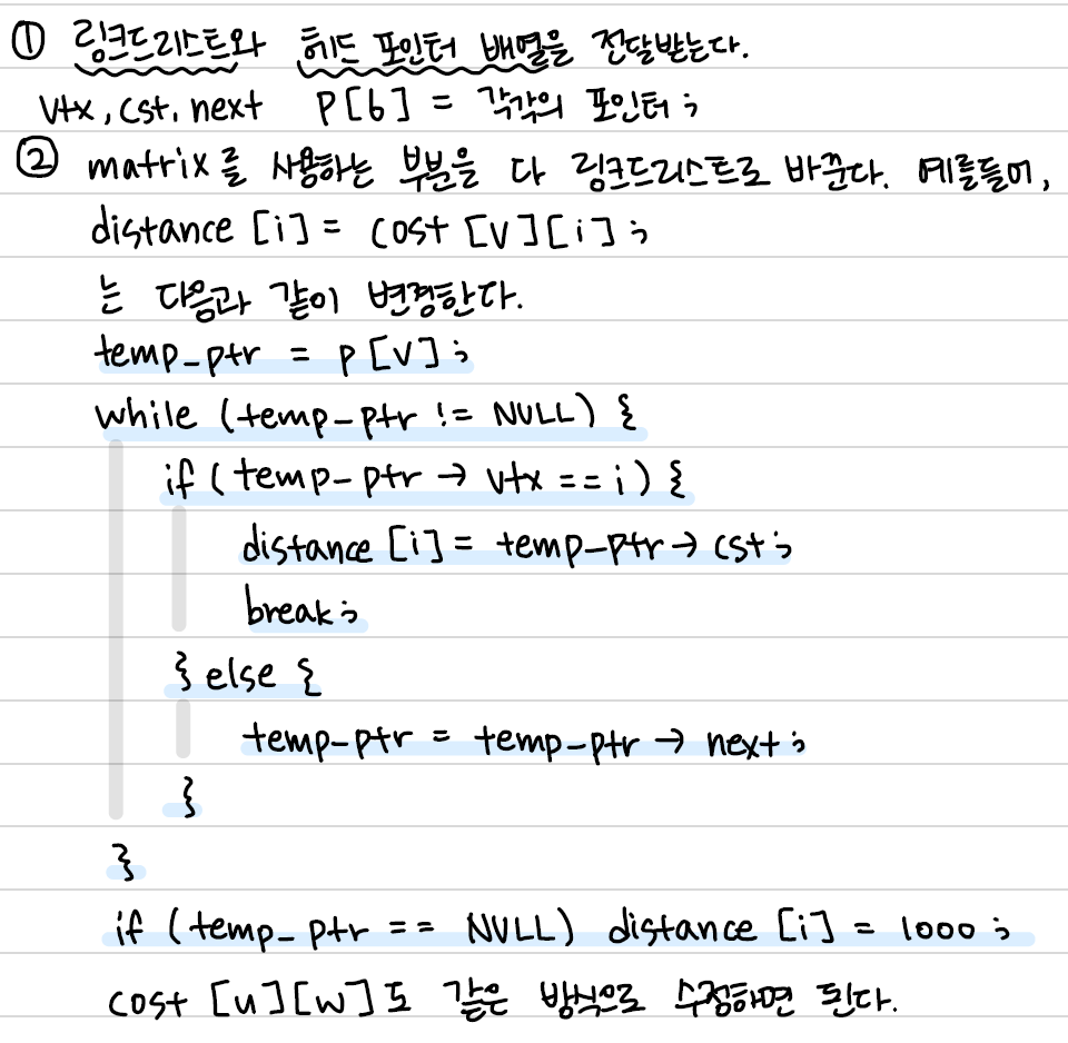 (d) 교재 Program 6.9는 그래프가 adjacency matrix로 표현되어 있을 경우의 프로그램이다. 만약 그래프가 adjaceny list로 표현되었다면 프로그램의 어느 부분을 어떻게 수정해야 하는지 설명하시오. (c)의 adjaceny list 예를 이용하여 설명하시오.