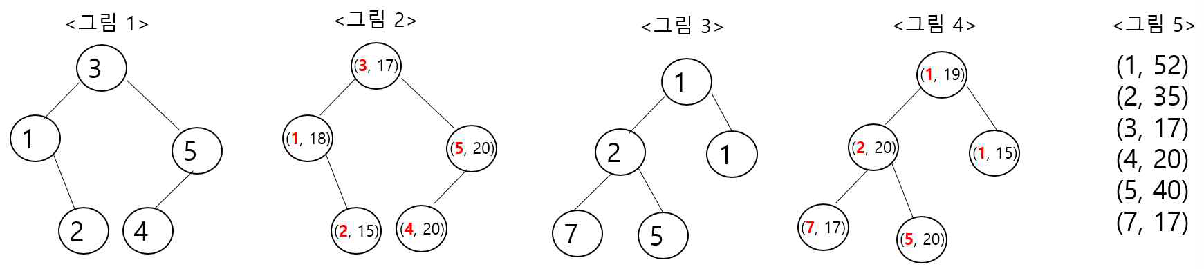 binary search tree는 노드에 key 값만 저장하는 것이 아니라 key값과 관련된 정보(associated item)를 같이 저장한다. 후자를 단순히 value라고 하자. 이 (key, value) 쌍을 보통 dictionary pair라고 부른다 (교재 ADT 5.3 Dictionary 참조). <그림 1>은 binary search tree의 예로 각 노드에 키 값만 나타낸 것이다. <그림 2>는 각 노드에 (key, value) 쌍을 나타낸 것이다. (앞의 한자리 수는 key, 뒤의 두자리 수가 value) complete binary tree로 표현되는 heap도 노드에 (key, value) 쌍을 저장할 수 있다. (교재 5.6.3절에는 heap의 노드에 저장되는 데이터의 구조체 type element가 정의되어 있는데 key와 other fields로 구성된다.) 단, binary search tree에서는 모든 노드의 key가 서로 값이 다른데 반해, heap에서는 응용에 따라 노드의 key 값들이 중복될 수도 있다. <그림 3>은 min heap의 예이다. 노드에는 key 만 표시되어 있다. <그림 4>는 각 노드에 (key, value) 쌍을 나타낸 것이다. <그림 5>는 <그림 2>와 <그림 4>의 (key, value) 쌍들을 읽어서 각 key 값별로 해당 value의 합을 구해 key 값 오름순으로 출력한 것이다. 예를 들어, 첫줄의 (1, 52)는 key=1의 value가 <그림 2>에서는 18, <그림 4>에서는 key=1인 노드가 2개이고 그 value가 각각 19와 15이다. 따라서 18+19+15=52로 합이 계산된 것이다. key=3처럼 어느 한쪽에만 값이 있으면 그 value만 출력된다. key=6인 쌍은 양쪽 구조에 다 부재하여 출력되지 않았다.