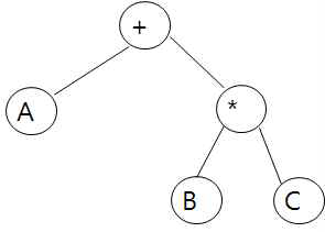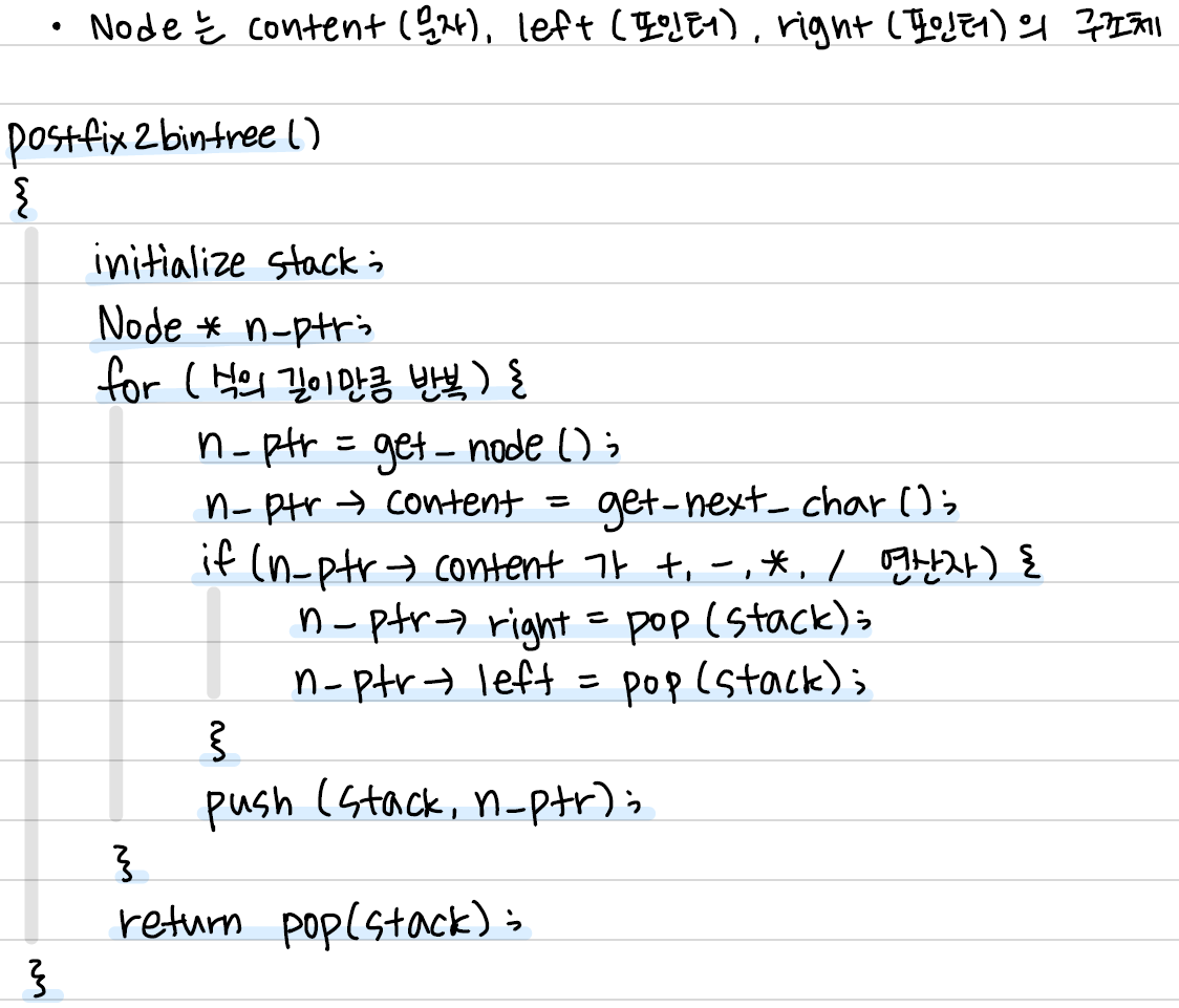 이항 사칙연산(+,-,*,/)으로 구성된 postfix식을 입력받아 해당 연산과정을 표현한 binary tree를 linked representation으로 생성하여 그것의 루트 노드로의 포인터를 반환하는 알고리즘 postfix2bintree()를 작성하고자 한다. 예: postfix 식 ABC*+$ 가 주어지면 ($는 string 끝 표시) 아래 binary tree가 생성되고 루트 노드(즉, + 노드)로의 포인터가 반환됨. postfix2bintree()를 슈도코드로 작성하시오. 단, postfix식의 operand는 1 char (예: A, B, ...)라 가정. 또한 postfix식의 다음 char를 반환해주는 get_next_char() 함수와 binary tree의 노드 하나를 할당해주는 get_node() 함수가 제공된다고 가정.