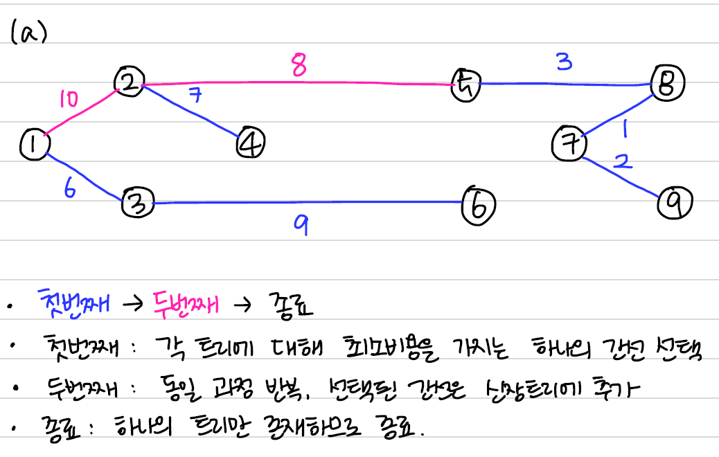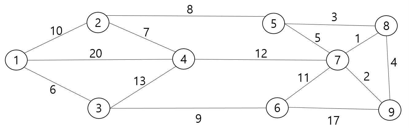 (a) 아래 그래프의 min cost spanning tree를 Sollin의 알고리즘으로 구하는 과정을 보이면서 설명하시오.