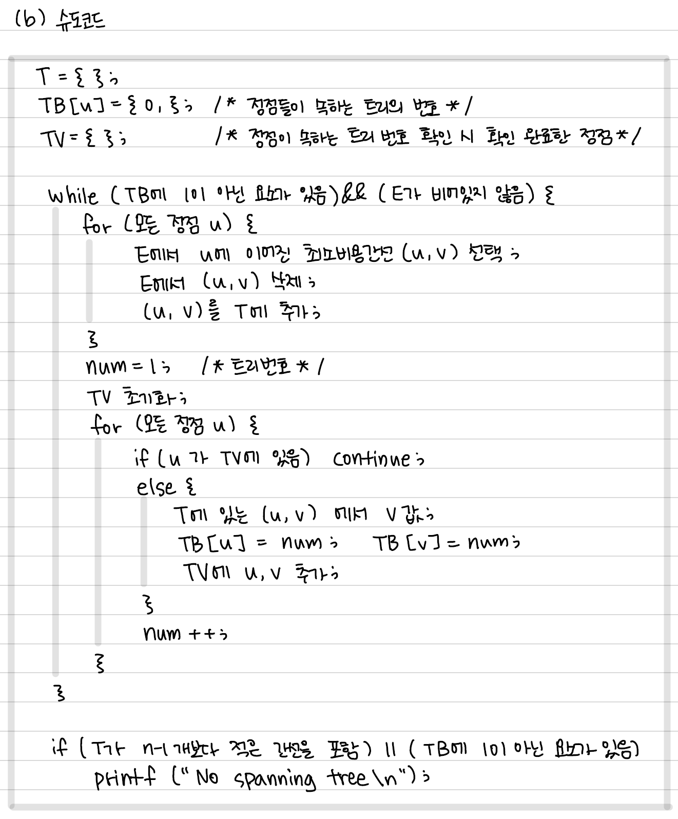 (b) 교재 Program 6.7에는 Kruskal의 알고리즘이, Program 6.8에는 Prim의 알고리즘이 각각 슈도코드로 기술되어 있다. Sollin의 알고리즘을 기술하는 슈도코드를 Program 6.7 및 Program 6.8과 명세하는 명령어의 상세 수준이 유사하도록 하여 쓰시오.