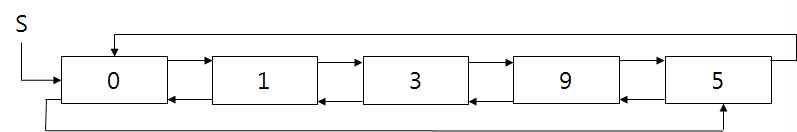 양의 정수를 원소로 하는 집합을 header가 있는 circular doubly linked list로 표현한다고 하자. 예를 들어, 집합 S = {1, 3, 9, 5}는 아래 그림과 같이 표현된다. (S가 가리키는 0 이 저장된 노드가 header 노드)