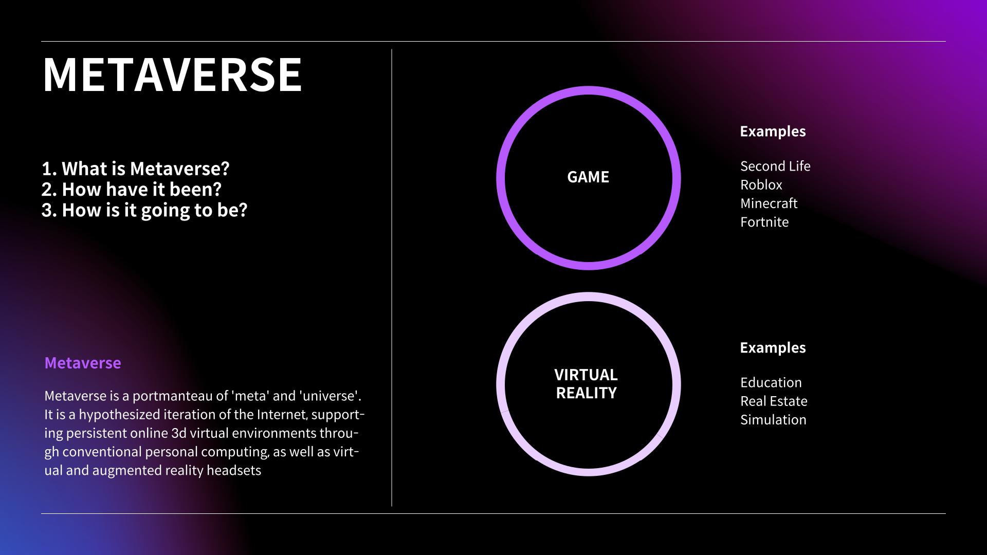 Several components of metaverse technologies have already been developed within modern internet-enabled video games. People usually think metaverse is only for the games, and that's because it has been developed in those ways the most, and they are the easiest ways to think out. So if it reminds you of the games like Second Life, Roblox, Minecraft, or Fortnite, it means you already know and experienced the metaverse in your life.