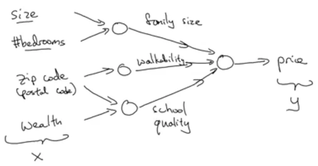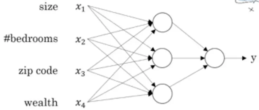 제가 그린 이 작은 원들은 ReLu 유닛일 수도 있고 다른 비선형 함수일 수도 있습니다. 집의 크기와 침실의 갯수는 가족의 크기를 우편번호와 재력은 학교의 질을 예측할 수 있게 해줍니다. 그리고 마지막으로 사람들이 얼마를 지불할 용의가 있는지 결정하는 것이 진짜로 알고 싶은 중요한 정보이고, 가족의 크기나 걷기 좋은지, 학교의 질은 가격을 예측하는 데 도움을 줄 것입니다.