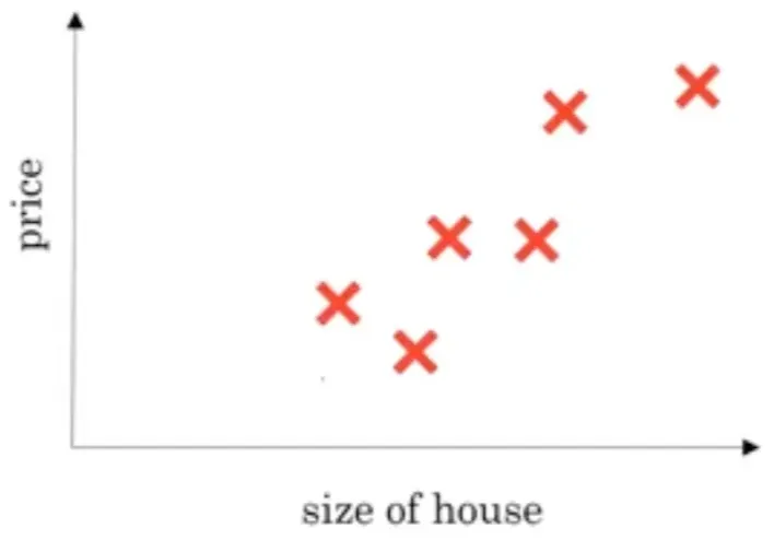 주택 가격 예측 예제로 한번 시작해봅시다. 6개의 주택 데이터를 가지고 있다고 해봅시다. 그래서 제곱 피트나 평방 미터로 되어있는 주택의 크기를 알고 있고, 주택의 가격도 알고 있고, 주택의 크기를 알고 있을 때 주택의 가격을 예측할 수 있는 함수를 만든다고 합시다.