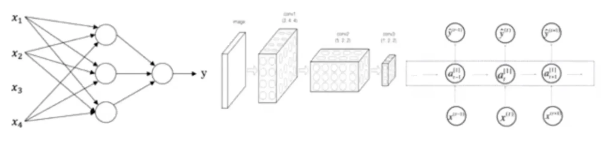 그럼 CNN과 RNN의 기준이 무엇인지 좀 더 명확하게 알아봅시다. 논문에서 이런 종류의 그림을 보셨을겁니다. 표준 신경망입니다. 이런 그림도 보았을 텐데 이것은 합성곱 신경망의 예시입니다. 이후 강의에 이 그림들이 무슨 뜻인지 어떻게 구현하는지 알아볼 것입니다. 보통 이미지 데이터는 합성곱 신경망에서 사용됩니다. 이런 그림들도 본적 있을텐데 어떻게 구현하는지도 이후에 배울 겁니다. 순환 신경망은 1차원 시퀀스 데이터에 강합니다. 거기엔 시간적 요소가 있을 수 있습니다.