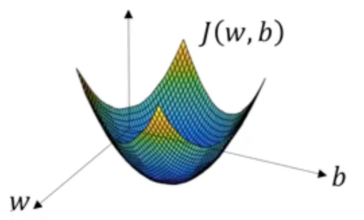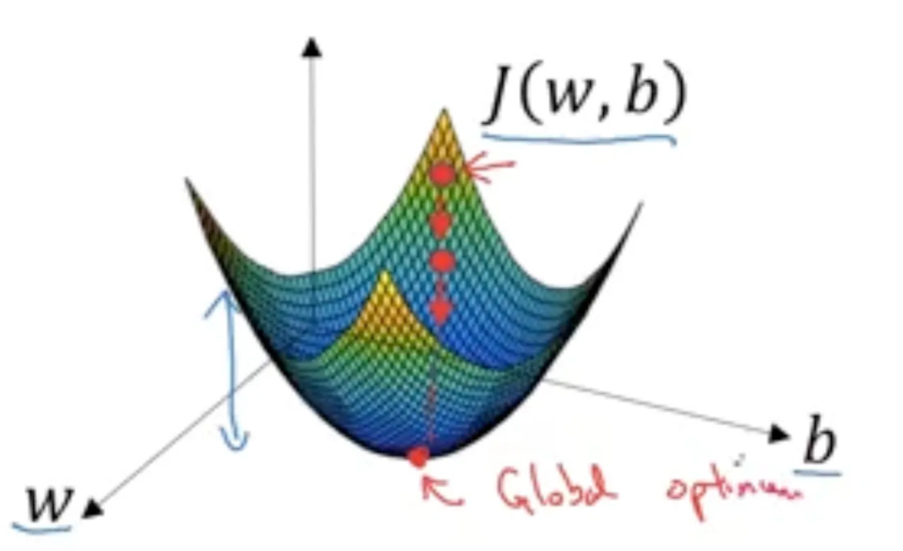 비용 함수는 매개변수 $w$와 $b$가 훈련 세트를 잘 예측하는지 측정합니다. 그러면 매개변수 $w$와 $b$를 알아내기 위해서는 비용 함수 $\mathcal{J}(w, b)$를 가장 작게 만드는 $w$와 $b$를 찾아야 할 것입니다.