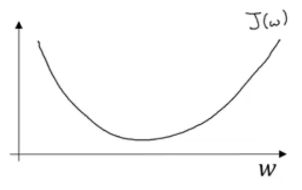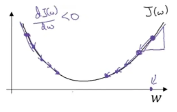 반대로 $w$가 여기(왼쪽) 있었다면 기울기 $\frac{d\mathcal{J}(w)}{dw}$는 음수가 되고, $α$에 음수를 곱한 값을 빼게 되므로 서서히 $w$를 증가시키게 됩니다. 각 반복마다 $w$가 점점 증가하는 것입니다. 그러면 왼쪽에서 초기화하던, 오른쪽에서 초기화하던, 경사 하강법은 매개변수를 전역 최솟값까지 도달하게 해 줍니다.