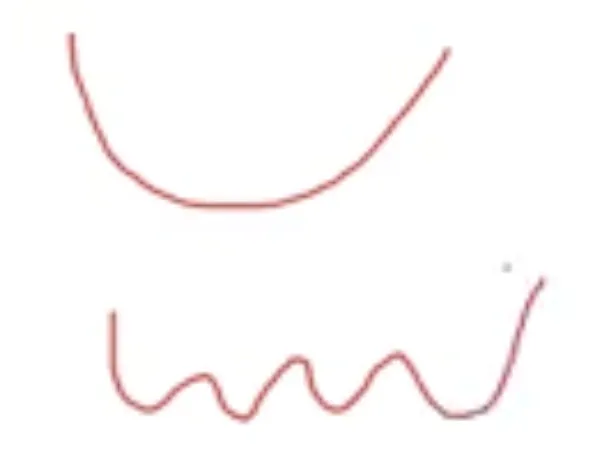 여기서 비용 함수 $\mathcal{J}$의 최솟값에 해당하는 $w$와 $b$를 찾아야 합니다. 이 특정 비용 함수 $\mathcal{J}$는 활처럼 볼록한 함수(위)입니다. 볼록하지 않은 함수는 이런 함수(아래)로서 지역 최적값이 여러 개입니다. 이 비용 함수 $\mathcal{J}(w, b)$가 볼록하다는 사실이 로지스틱 회귀에 위의 비용 함수 $\mathcal{J}$를 사용한 큰 이유 중 하나입니다.