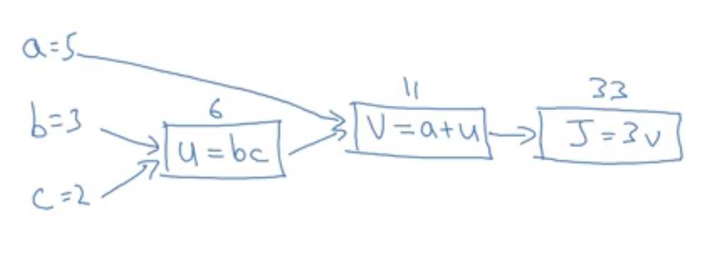 다음에 $v = a + u$라고 할 때 $v$를 계산해야 합니다. 마지막으로 출력값 $\mathcal{J} = 3v$입니다. 이것이 함수 $\mathcal{J}$의 계산입니다. 이것이 계산하려고 했던 함수 $\mathcal{J}$의 마지막이죠.