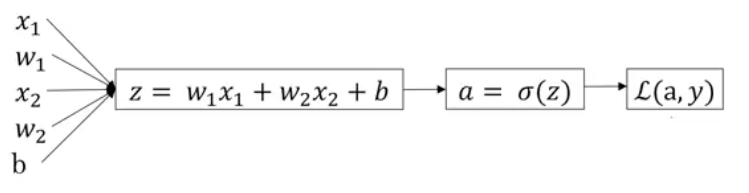 이걸 사각형 안에 넣고, 그 다음엔 $\hat{y} = a = \sigma(z)$를 계산합니다. 이게 계산 그래프에서의 다음 단계이고, 마지막으로 $\mathcal{L}(a, y)$를 계산합니다. 식을 다시 쓰진 않겠습니다. 로지스틱 회귀에서의 목적은 매개변수 $w$와 $b$를 변경해서 이 손실을 줄이는 것입니다.