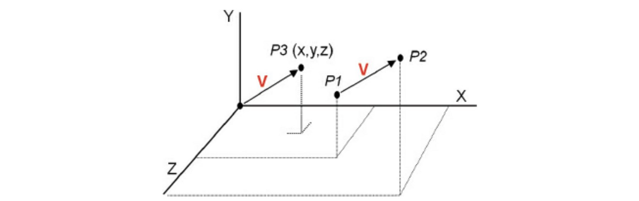 흔히 3D 그래픽에서는 정점(x, y, z 3차원의 좌표값을 갖는)을 벡터와 혼용하기도 합니다. 개념적 혼란을 방지하기 위해 정점 클래스와 벡터 클래스를 구분하여 사용하는 API도 있고, 사실상 컴퓨터가 계산하는 데에는 지장이 없기 때문에 벡터 클래스로 정점을 표시하는 API도 있습니다. 우리가 사용할 GLSL과 GLM은 둘을 전혀 구분하지 않습니다.