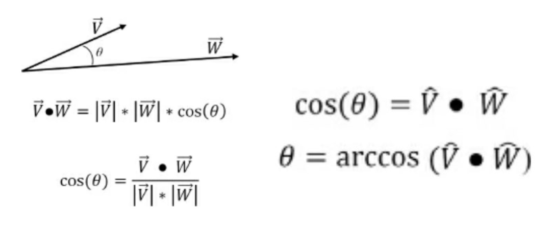두 벡터가 정규화가 된다면, 위와 같이 계산할 수 있습니다. θ각 자체보다 cos(θ)를 활용해야 할 때가 자주 있기 때문에, 오른쪽 두가지 식 모두 기억해 놓는 것이 좋습니다.