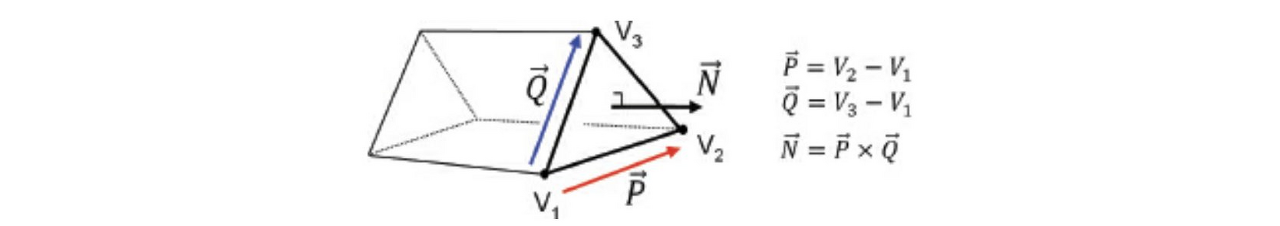 위 그림은 오른손 좌표계를 따르고 있습니다. 이러한 외적 계산을 통한 법선벡터 찾기 연산은, 추후에 lighting(라이팅) 작업에 유용합니다. 아래와 같이 표면의 외부 법선을 계산하여 비춰지는 빛의 양을 계산할 것입니다.