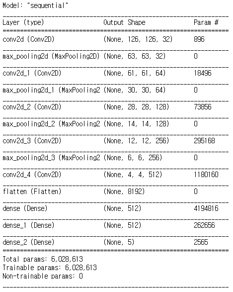 6) dense layer를 통해 늘어난 node의 수를 축소, 이 때의 parameter는 적절한 크기로 설정 (이 프로그램에서는 flatten시 parameter 크기가 100만개 이상이어서 512로 설정)