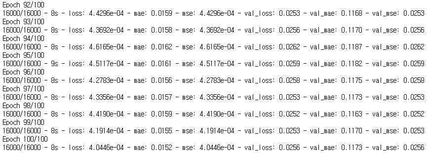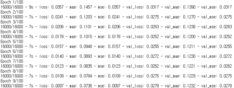 epochs(training 횟수)는 100으로 설정했다. 사실 이 프로그램의 경우 60회 이상 넘어가면 loss 값이 별로 줄어들지 않는다. (특히 validation) 하지만 그냥 100으로 했다.