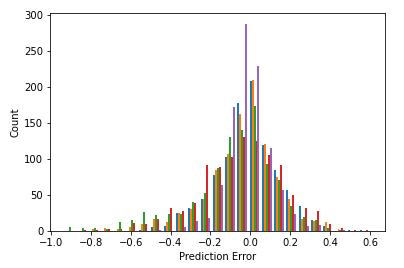 마지막으로, error 값을 히스토그램으로 나타내본다. 전체 값을 그대로 넣어 플롯을 찍으면, 파라미터 별로 오차값을 따로 나타내준다.