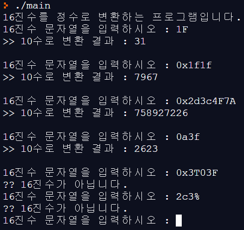 - 예외 처리 : ishexa()의 반환 값이 0인 경우 오류 메시지 출력 후 입력을 다시 받음