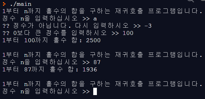 printf("1부터 n까지 홀수의 합을 구하는 재귀호출 프로그램입니다.\n");