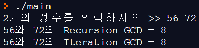 printf("%d와 %d의 Iteration GCD = %d\n", num1, num2, iGDC(num1, num2));