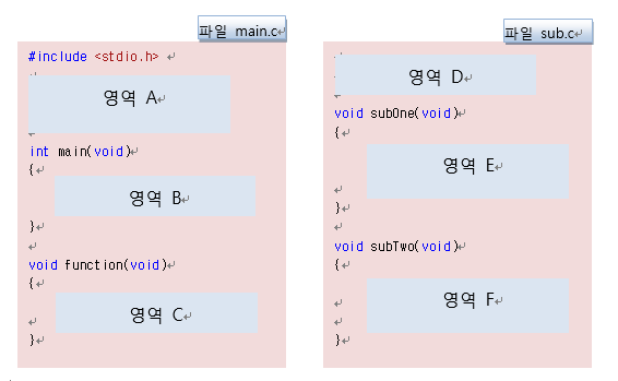 다음은 프로젝트를 구성하는 파일 main.c와 sub.c이다. 다음에서 각각 설명하는 변수를 선언할 영역을 구분하여 예제 프로그램을 만들어 보고, 필요한 경우 임의의 초기 값을 넣어 컴파일 해보시오.
