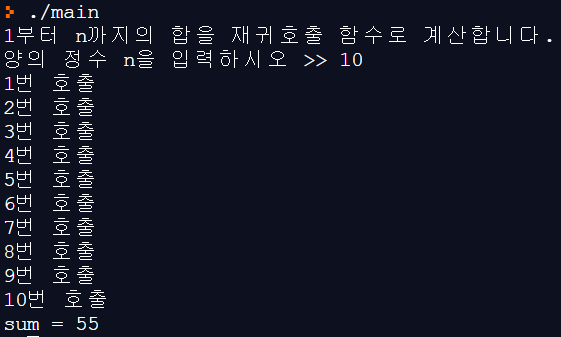 printf("1부터 n까지의 합을 재귀호출 함수로 계산합니다.\n양의 정수 n을 입력하시오 >> ");