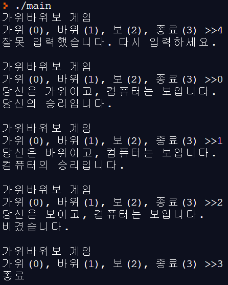 printf("가위(0), 바위(1), 보(2), 종료(3) >>");