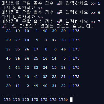 printf("n이 %d인 마방진의 결과는 다음과 같습니다. \n", input);