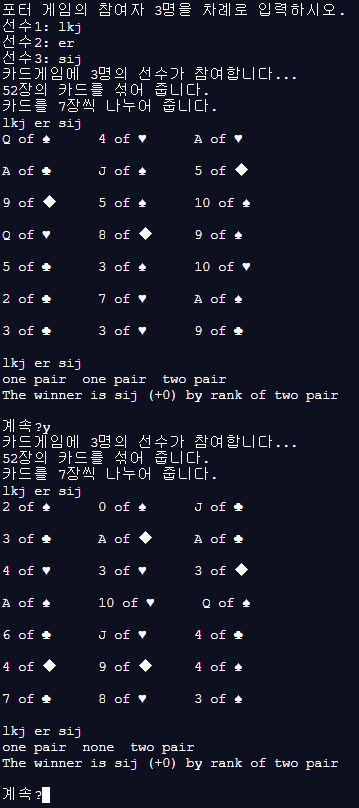 - 3명의 Player에게 7장의 카드를 나누어주는 과정을 다음과 같이 출력하도록 한다