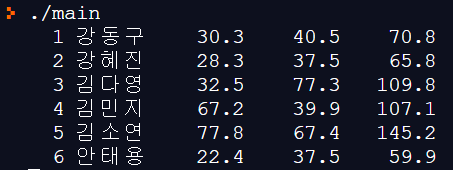다음 파일(in.txt) 내용을 참고하여 구조체를 정의하고, 그 내용을 읽어 동적으로 자료를 만들어 연결리스트를 구성하시오. 각 학생의 점수의 합을 구하여 아래와 같이 연결리스트를 출력하는 프로그램을 작성하시오.