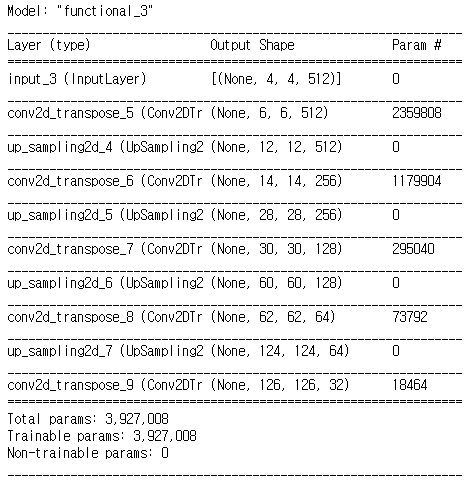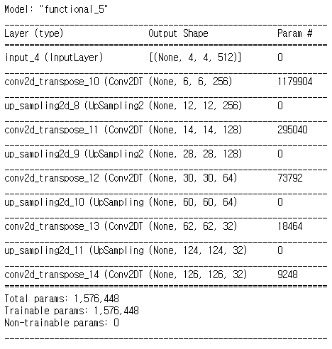 파라미터, 이미지크기, 채널 수에 유의하며 Decoder에 레이어를 추가해주었다. Decoder의 레이어들: