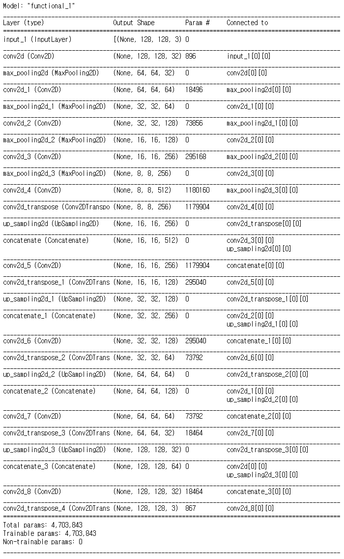 따라서 Decoder 부분에 Skip Connection 레이어를 추가하여, Encoder의 Convolution 레이어와 Decoder의 Upsampling 레이어를 연결해준다. Concatenate를 사용할 경우 8x8x256의 레이어 두개를 연산하면 8x8x512의 결과를 출력하므로, Conv2D 레이어도 추가로 넣어주어 다시 8x8x256의 결과를 출력하도록 연산한다. Decoder 레이어: